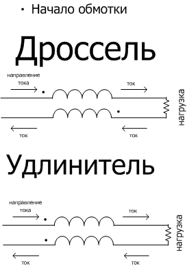На схеме точка обозначает начало обмотки (все витки наматываются в одну сторону), стрелки показывают направление тока. В чем отличие дросселя от удлинителя, в дросселе ток входит в начало первой обмотки, проходит через нагрузку и входит в начало второй обмотки, в удлинителе ток после нагрузки входит в конец второй обмотки.