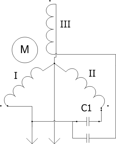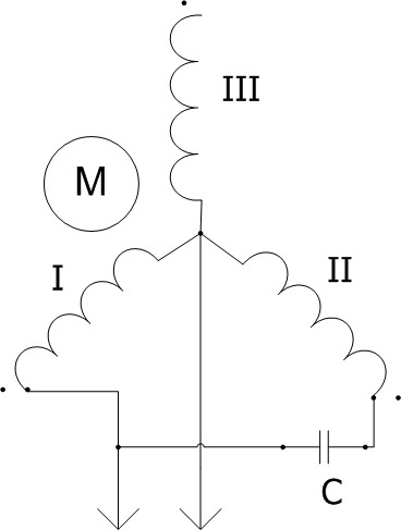 Для нормальной работы асинхронного трехфазного двигателя требуется подавать на каждую обмотку напряжение, сдвинутое по фазе относительно напряжения на других обмотках, так как фазы три то оно сдвигается на 1200. При обычном подключении трехфазного двигателя к однофазной сети , на одну обмотку подается фаза, на другую фаза сдвигается конденсатором, а третья обмотка подключается без сдвига фаз. Так вот третья обмотка создает момент вращения в противоположном направлении. Поэтому лучших результатов можно добиться, отключив одну обмотку. Так двигатель будет работать аналогично однофазному двигателю. Кстати у трехфазных двигателей часто сгорает одна обмотка, а две остаются целыми, такой двигатель можно здесь применить.